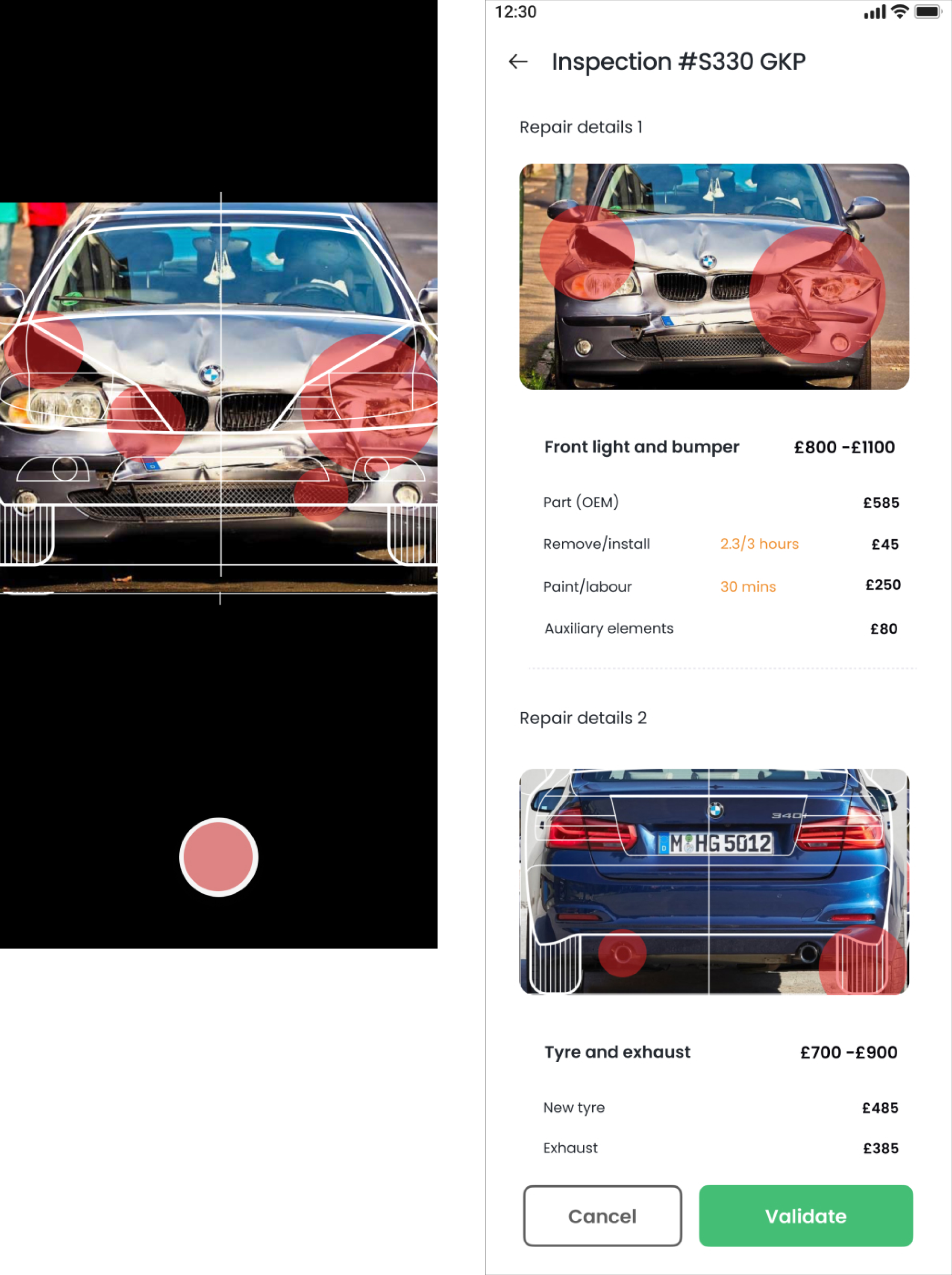 Providing both "Cancel" and "Validate" options gives users control over proceeding with the repairs or canceling if they are not satisfied with the assessment.
