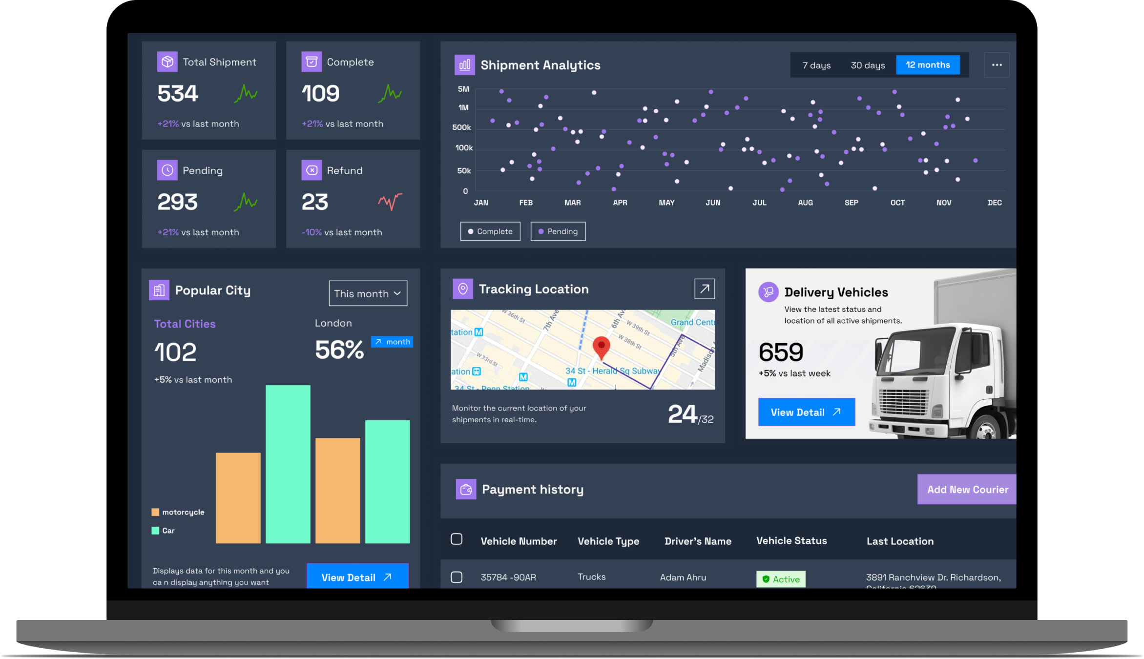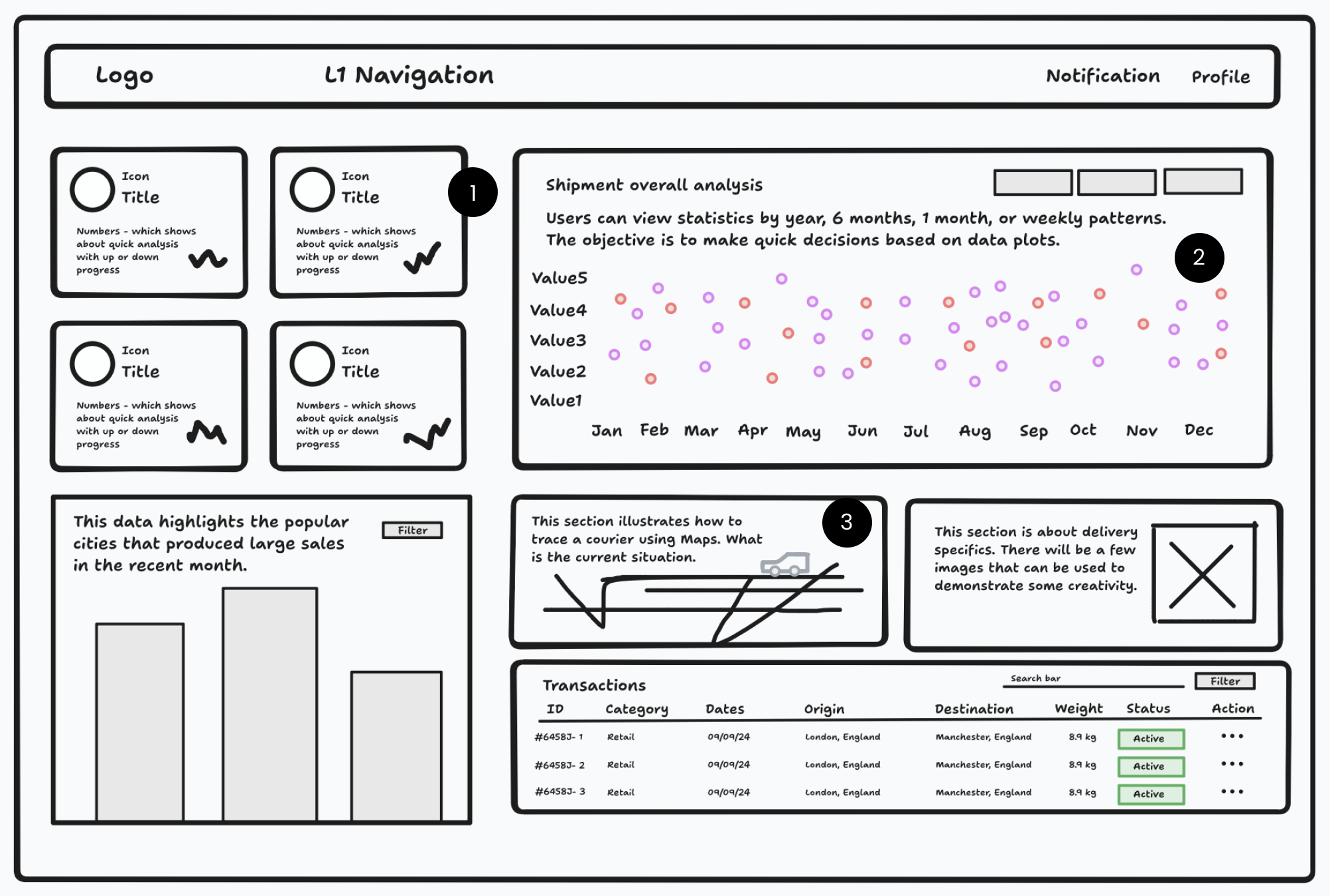 1.Key Metrics and Quick Analysis - Four icon cards display key metrics like shipment status, delivery times, and performance trends with icons and numbers for quick analysis.