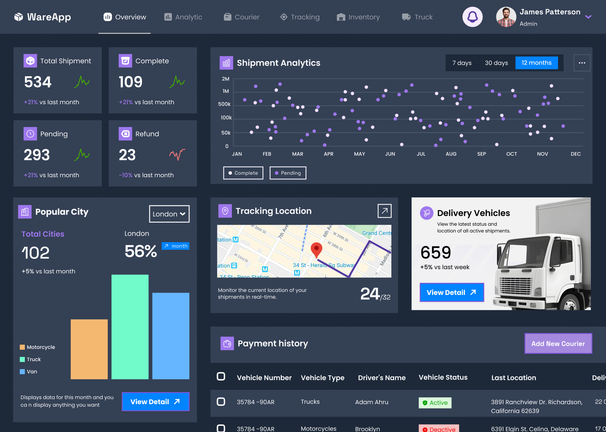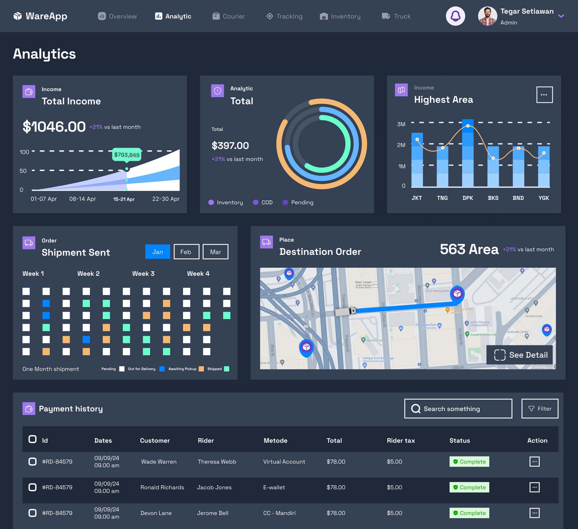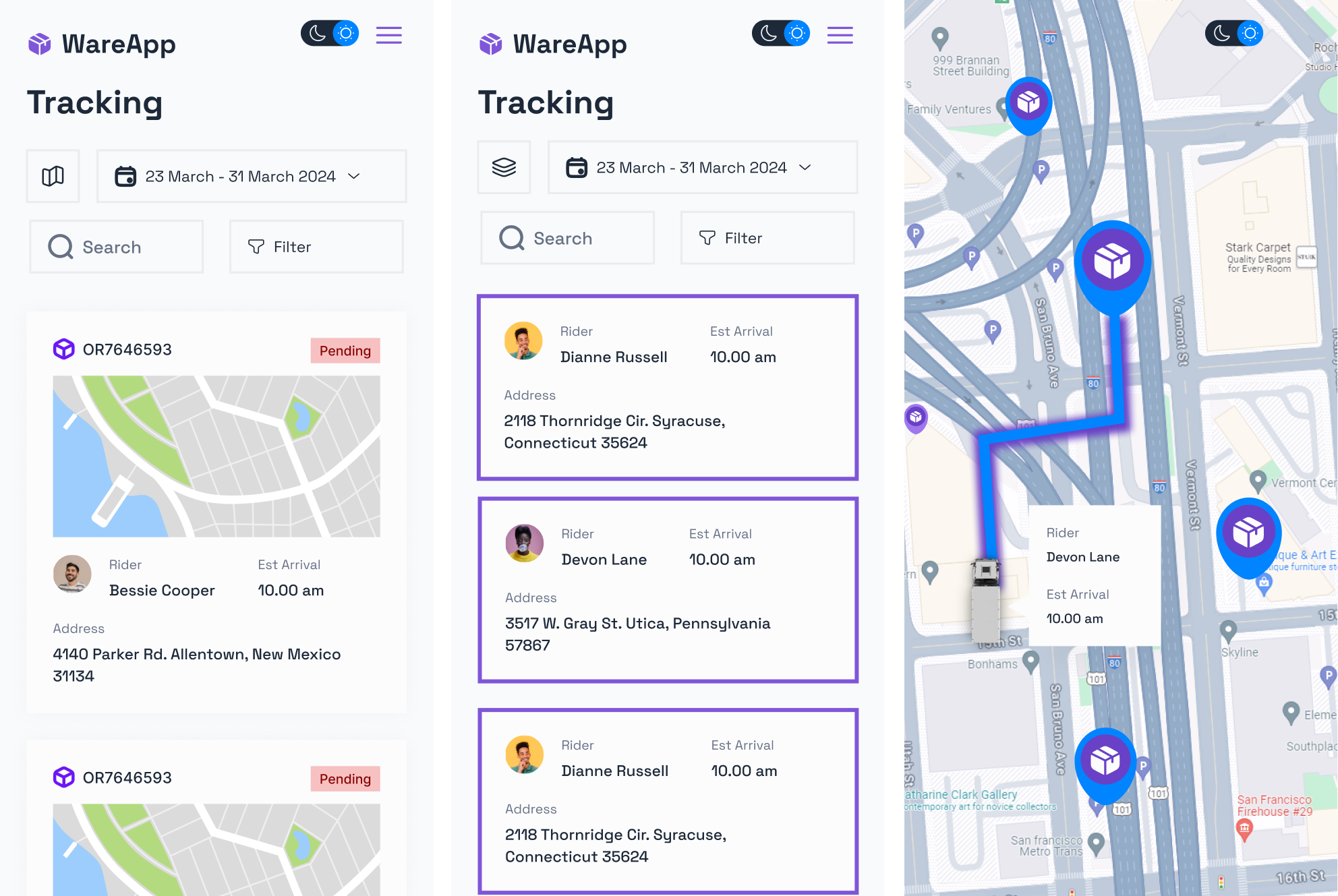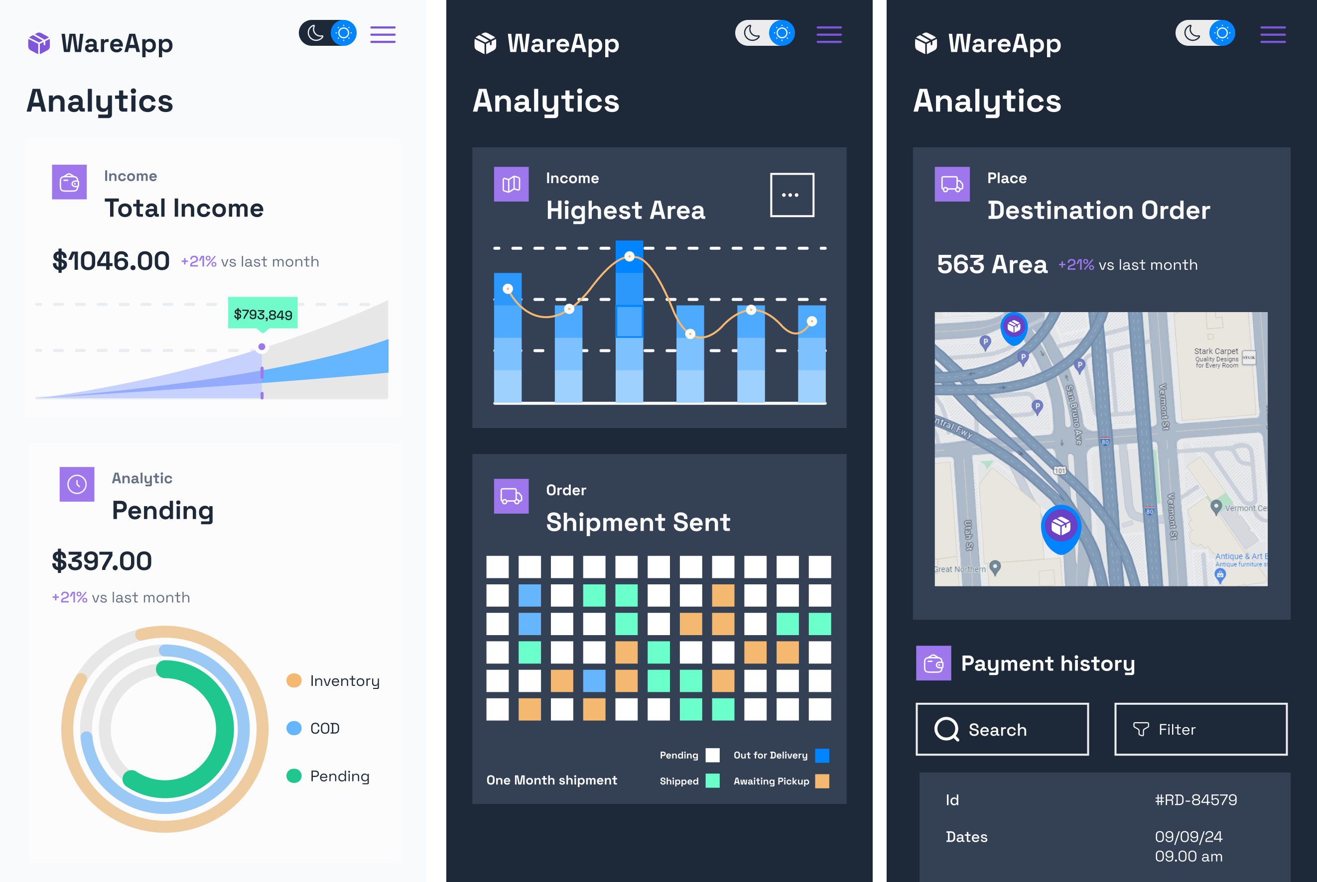 Warehouse Management with real-time tracking, detailed analytics, secure payments, and inventory management. The intuitive UI ensures high contrast and legibility, making the app accessible and user-friendly for efficient delivery operations.