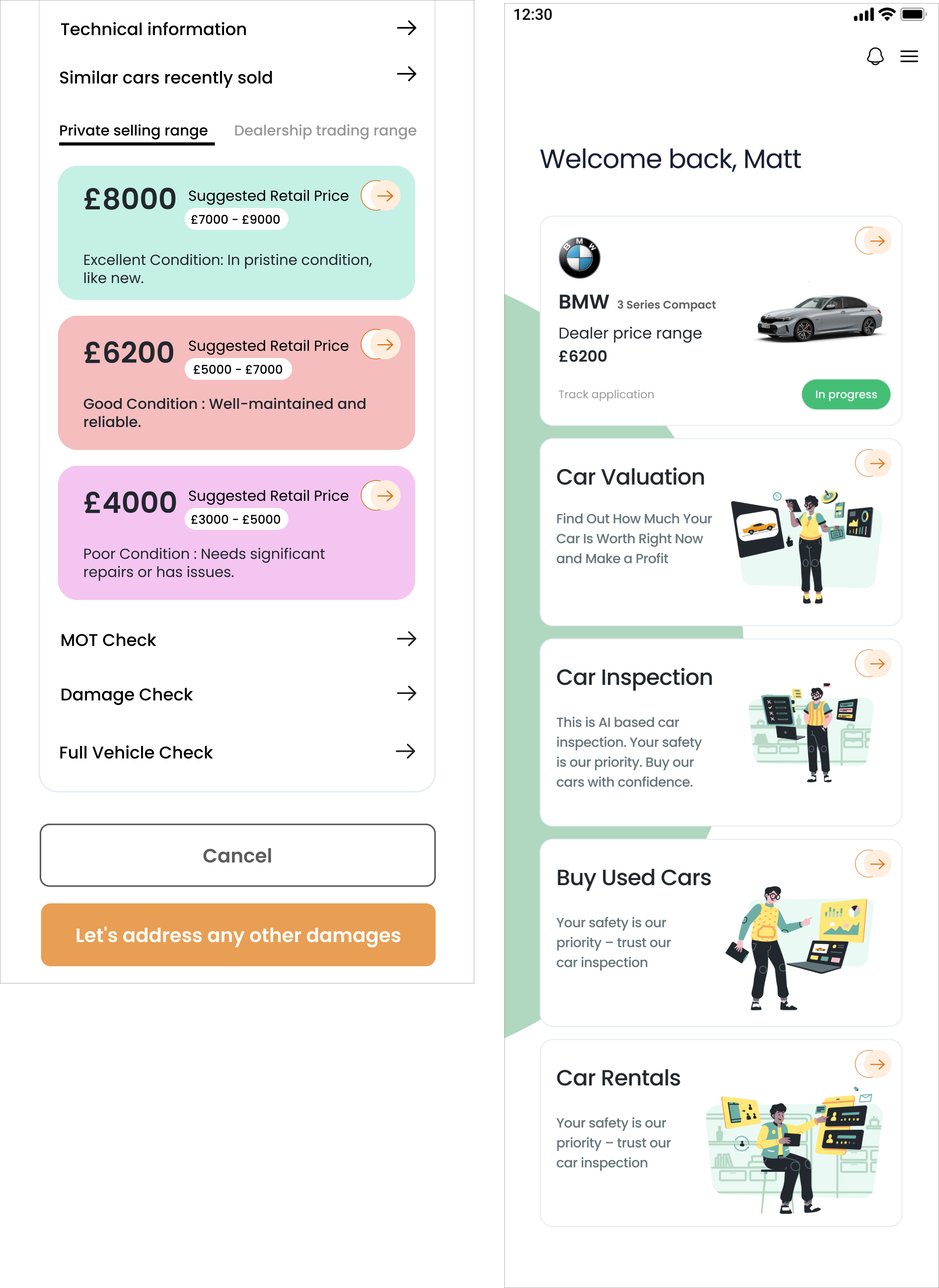 Personalized User Experience The app provides actionable insights by offering options for further checks, including MOT, Damage, and Full Vehicle Check. These options guide users on practical steps to potentially increase their car’s value or ensure its safety and reliability. The "Let’s address any other damages" button encourages proactive maintenance, which can lead to better valuation outcomes.